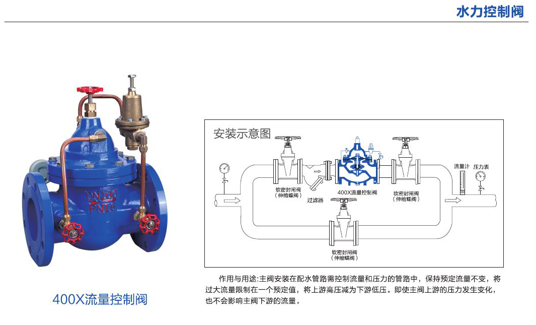 - 主閥安裝在配水管路需控制流量和壓力的管路中,保持預(yù)定流量不變,將過大流量限制在一個預(yù)定值,將上游高壓減為下游低壓。
