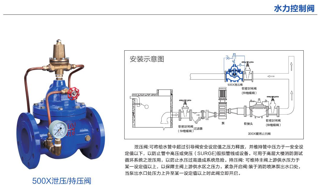 - 泄壓閥:可將給水管中超過引導(dǎo)閥安全設(shè)定值之壓力釋放,并維持管中壓力于一安全設(shè)定值以下,以防止管中高壓或突壓surge毀損管線或設(shè)備。