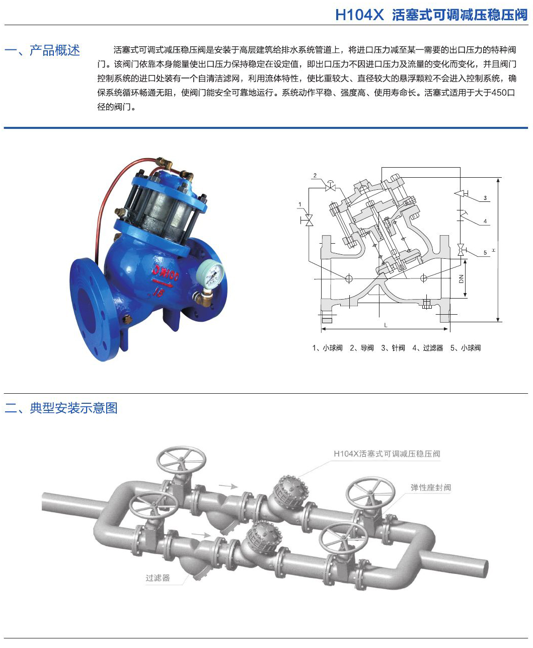 - 活塞式可調式減壓穩(wěn)壓閥是安裝于高層建筑給排水系統(tǒng)管道上,將進口壓力減至某一需要的出口壓力的特種閥門。