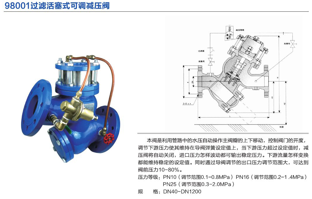 - 利用管路中的水壓自動(dòng)操作主閥瓣的上下移動(dòng),控制閥門的開度,調(diào)節(jié)下游壓力使其維持在導(dǎo)閥彈簧設(shè)定值上,當(dāng)下游壓力超過(guò)設(shè)定值時(shí),減壓將自動(dòng)關(guān)閉,進(jìn)口壓力怎么波動(dòng)都可輸出穩(wěn)定壓力。
