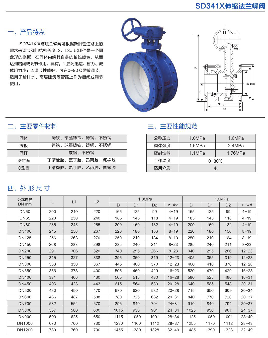 - SD341X伸縮法蘭蝶閥可根據(jù)新舊管道路上的需求來調(diào)節(jié)閥門結(jié)構(gòu)長度L2、L3。