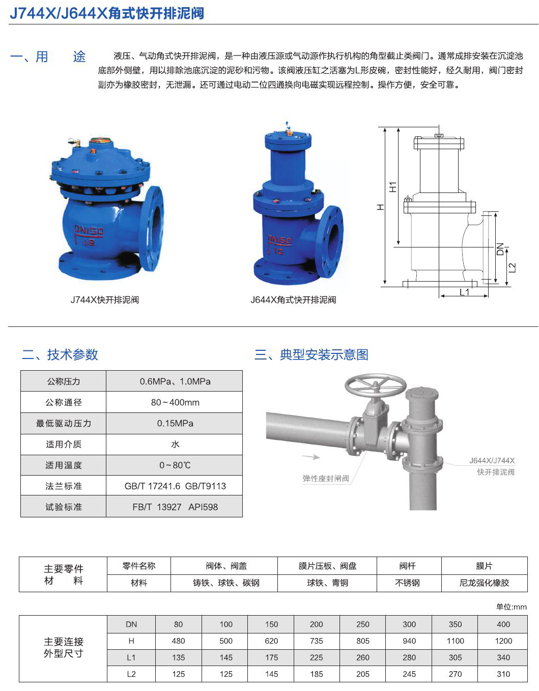 - 液壓、氣動角式快開排泥閥,是一種由液壓源或氣動源作執(zhí)行機構(gòu)的角型截止類閥門。通常成排安裝在沉淀池底部外側(cè)壁,用以排除澉底沉淀的泥砂和污物。