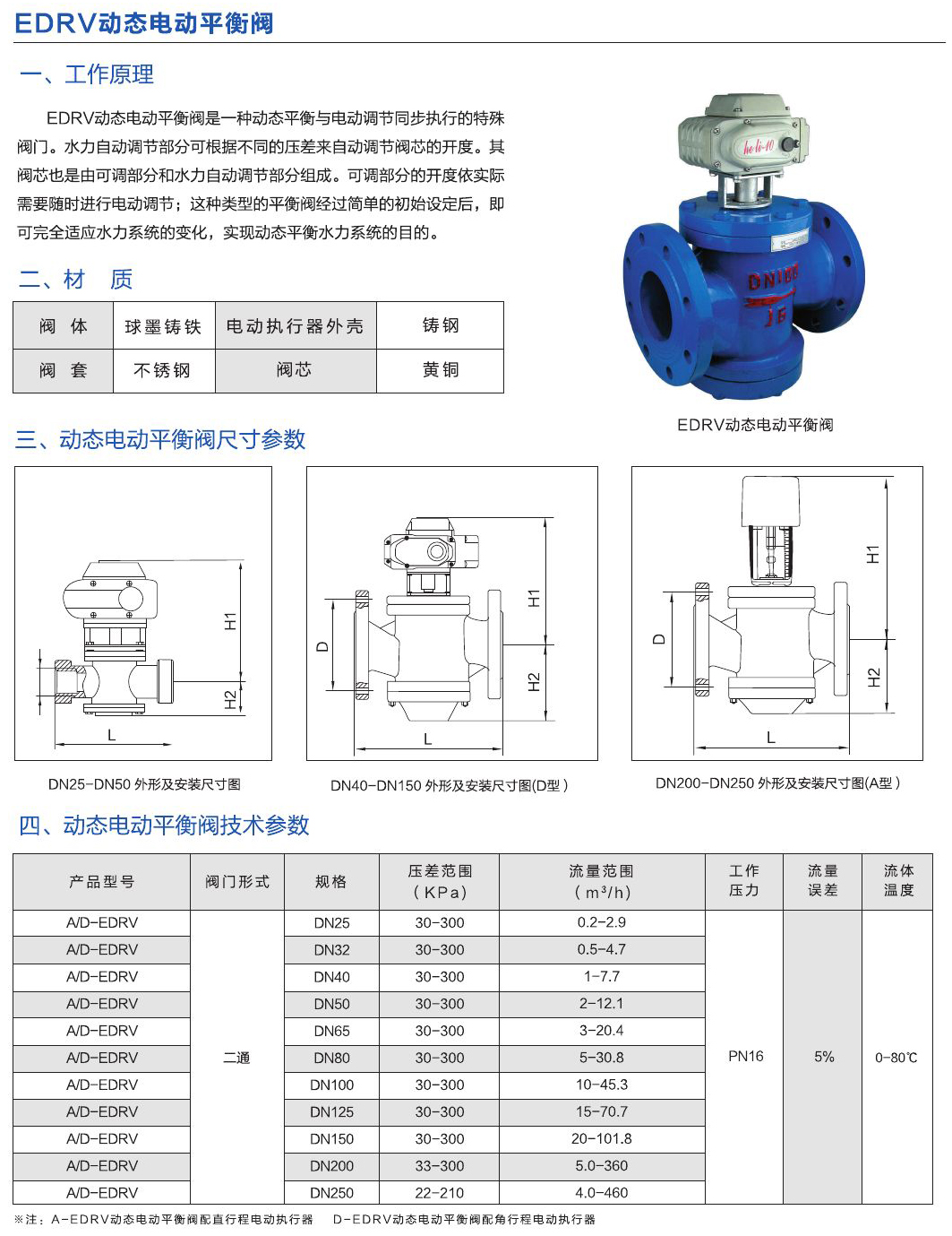 - EDRV動態(tài)電動平衡閥是一種動態(tài)平衡與電動調(diào)節(jié)同步執(zhí)行的特殊閥門。水力自動調(diào)節(jié)部分可根據(jù)不同的壓差來自動調(diào)節(jié)閥芯的開度。其閥芯也是由可調(diào)部分和水力自動調(diào)節(jié)部分組成。