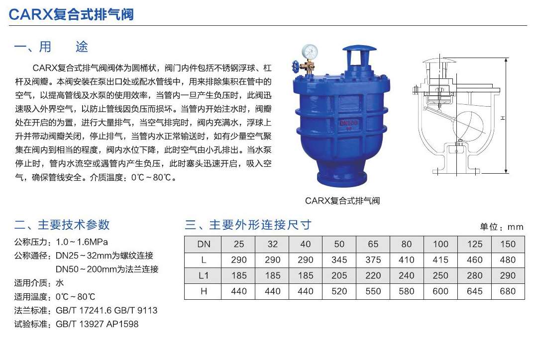 - CARX復(fù)合式排氣閥閥體為圓桶狀,閥門(mén)內(nèi)件包括不銹鋼浮球、杠桿及閥瓣。
