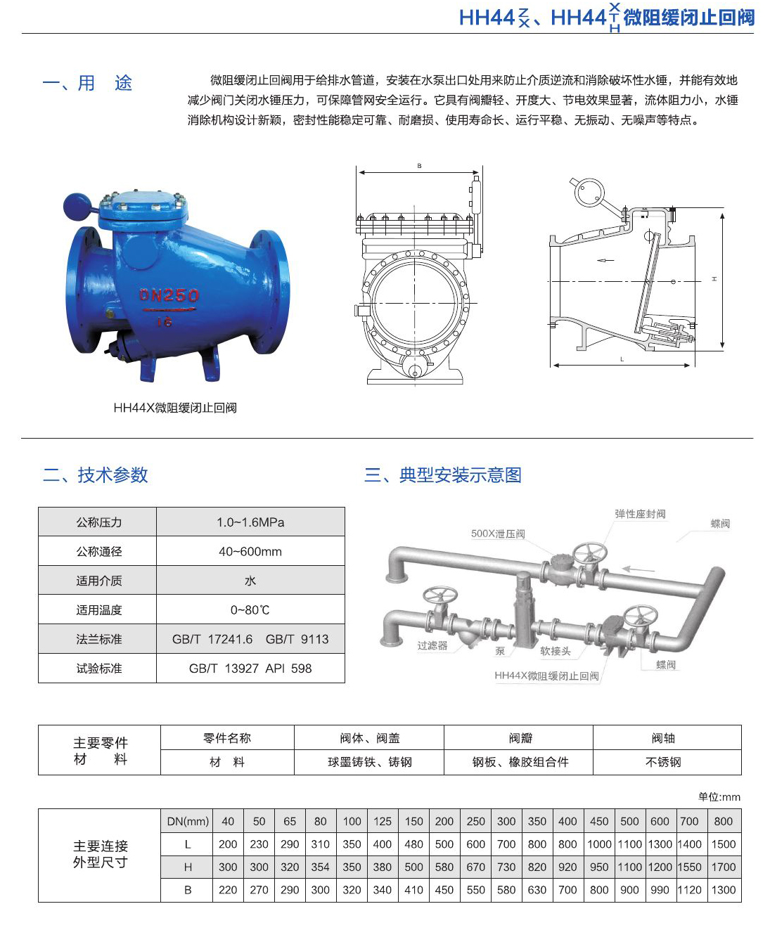 - 微阻緩閉止回閥用于給排水管道,安裝在水泵出口處用來防止介質逆流和消除破壞性水錘,并能有效地減少閥門關閉水錘壓力,可保障管網安全運行。