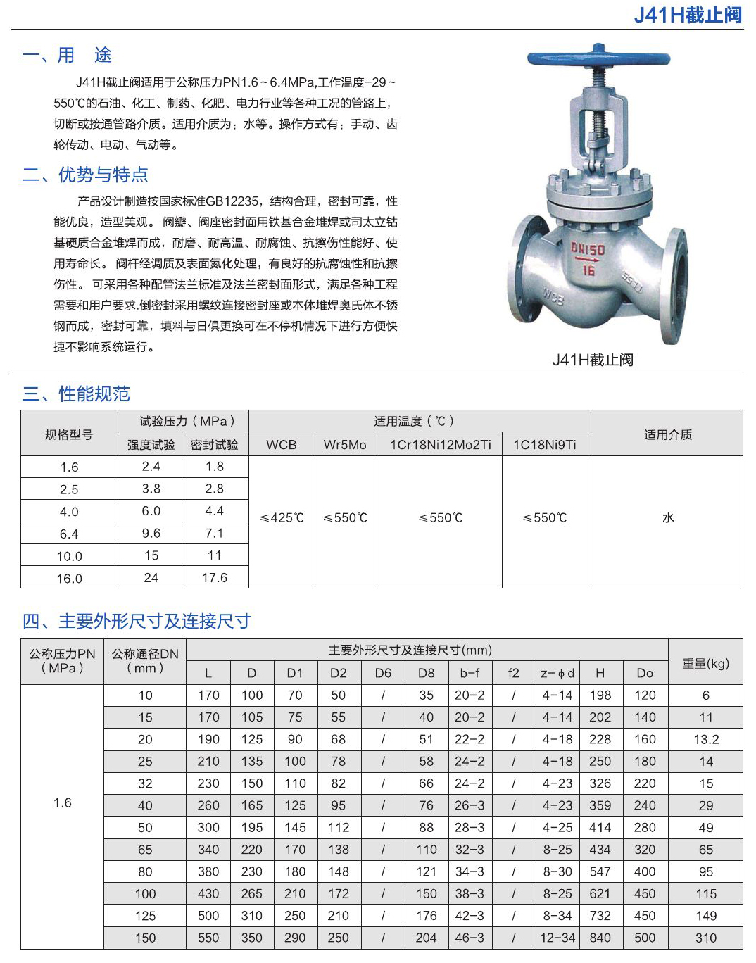 - J41H截止閥適用于公稱(chēng)壓力PN1.6-6.4MPa,工作溫度-29~550的石油、化工、制藥、化肥、電力行業(yè)等各種工況的管路上,切斷或接通管路介質(zhì)。
